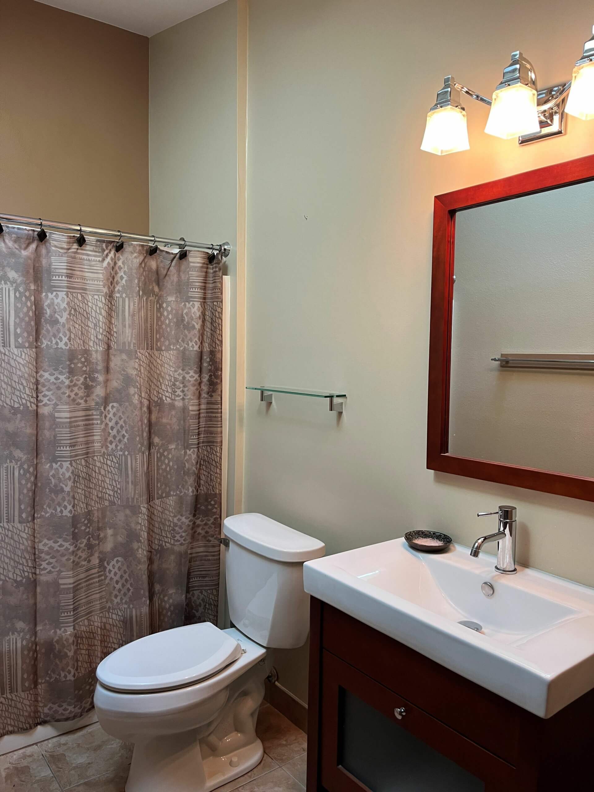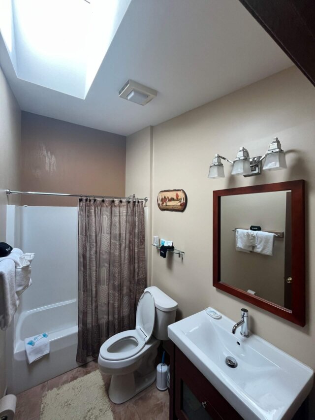 The bathroom is clean and well-maintained, featuring a shower/tub combo. Fresh towels will be provided.